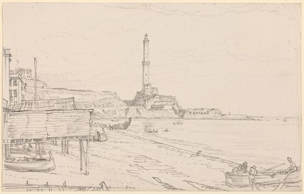Editor: So, we have here Georges Michel's "Gezicht op de Pompe à feu du Gros Caillou," a pencil drawing dating sometime between 1773 and 1843. It's quite simple, almost like a quick sketch, but I find the industrial structure surprisingly dominant in the landscape. What do you see in this piece, especially regarding its context? Curator: What strikes me is how Michel positions the steam pump within the tradition of landscape art. We often separate industry from "nature," but this drawing suggests their entanglement. Gros-Caillou was a district undergoing rapid industrialisation. The “Pompe à feu,” literally “fire pump”, was cutting-edge technology intended to serve a social purpose, yet its looming presence arguably also symbolises the shift in power from the agrarian to the industrial. Do you think Michel is celebrating or critiquing this industrial advancement? Editor: That's interesting, I hadn't considered that ambiguity. At first glance, it just seemed like a straightforward depiction. Perhaps it's both? There's a certain grandeur in the structure's scale, but the rather drab sky might suggest the environmental cost, even though this is just a sketch and hard to draw a direct conclusion. Curator: Precisely. Artists during this period were grappling with these questions of progress and its impact on society and the environment. Furthermore, how do you feel knowing this wasn’t just art for art’s sake, but art with civic significance due to this specific architectural feat? Editor: It definitely adds a layer of understanding to see it within this context of industrial advancement and societal impact. It moves the piece beyond a mere landscape and becomes more of a social commentary. I'll certainly be looking at other landscapes of this period with a more critical eye now! Curator: Excellent! That's precisely the point – to see how art is always engaged in dialogue with its time. Thank you, both, for this moment of reinterpretation!