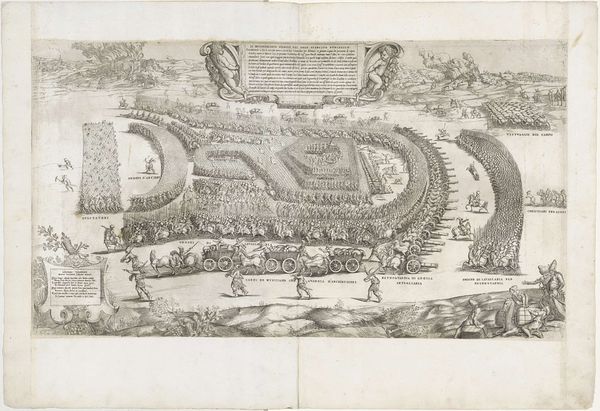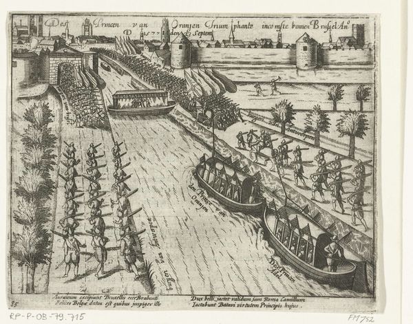 This is an engraving, made in 1585 by an anonymous artist, depicting the ship bridge constructed by the Duke of Parma. At first glance, one is struck by the rigid geometric patterns and the meticulous arrangement of elements. The composition is dominated by a series of parallel lines formed by boats and a pontoon bridge, creating a structured and almost architectural view of a military engineering feat. The linear perspective guides the eye across the water, emphasizing the ordered layout. The overall impression is one of control and precision. Looking closer, these formal elements intersect with semiotic meanings of power and engineering prowess. The bridge, a symbol of dominance, is emphasized through its repetitive structure and imposing scale. We could consider the relationship between the detailed depiction and the narrative of military control it conveys. The image, like a well-structured argument, presents a clear and persuasive case for the Duke's strategic capabilities. The engraving invites continuous reinterpretation, shaped by evolving perspectives on history, technology, and representation.