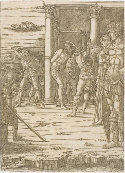 Editor: This print, titled "Speculum Romanae Magnificentiae: Romulus and Remus Building the Walls of Rome", was created sometime between 1530 and 1580 by an anonymous artist. It's currently housed here at the Met. It’s such a dynamic composition; the figures are so active. What strikes you most about the visual structure of this piece? Curator: Note the intricate use of line and form, typical of engravings from this period. Observe the dense cross-hatching, creating areas of shadow and volume. How do the orthogonal lines of the wall interact with the curvature of the figures' bodies? Does this interplay enhance or detract from the overall harmony? Editor: I see what you mean! The stark contrast creates tension, almost a visual push-and-pull. It's quite different from some of the smoother paintings of the time. It looks like chaos and structure clashing on a single plane. Curator: Precisely. Also, consider the surface articulation, which accentuates the figures, endowing the viewer with an unmissable sense of physical labor. Are you inclined to assign meanings based on these stark juxtapositions alone? Editor: Not entirely. But thinking about it structurally, I am starting to see how this creates layers of depth and interest that guide the eye. What does the positioning of the figures imply about their function in the narrative? Curator: The composition forces us to assess the weight that each figure carries in contributing to a coherent visual structure, with the wall standing at its geometrical backbone. By recognizing that form begets function, perhaps we might grasp some deeper meanings held by the artist? Editor: That is insightful. Now I'm noticing how each element really balances out! I have a new appreciation for printmaking as an artform! Curator: I’m glad you perceive it with new eyes! Visual assessment will help any developing connoisseur form unique perspectives on a given artwork.