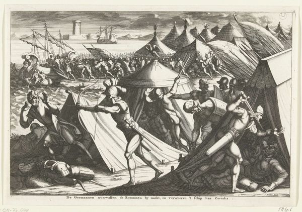 Gilliam van der Gouwen made this print titled 'Korach, Datan and Abiram and their families are swallowed up by the earth.' We see a dramatic biblical scene, visualized through the lens of 18th-century Dutch Protestantism, where challenges to religious authority are met with divine retribution. Korah, Dathan, and Abiram are shown being punished for their rebellion against Moses. Prints like these circulated widely in the Netherlands, a place where the assertion of religious authority was always fraught. Produced during the Dutch Golden Age, this image reflects a society grappling with its own identity and religious pluralism, using biblical narratives to explore themes of power, order, and the consequences of dissent. The starkness of the etching amplifies the narrative's moral lesson, fitting with the Protestant emphasis on personal piety and divine judgment. To fully appreciate such works, we often turn to historical archives, theological texts, and social histories to uncover the complex interplay between art, belief, and society. Art serves as a mirror reflecting the values and anxieties of its time.