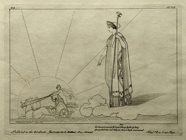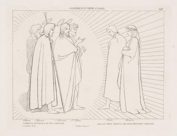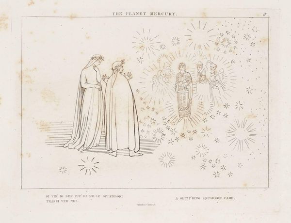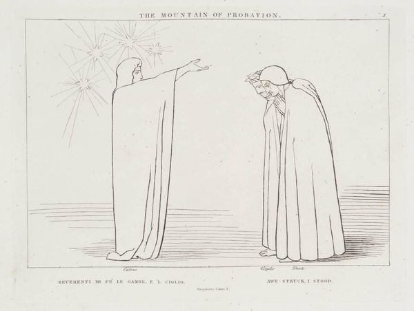Curator: This is John Flaxman's "Ascent to the First Heaven." Editor: The stark linearity creates a sense of ethereal ascent, doesn't it? Like walking into pure light. Curator: Indeed. Flaxman evokes the cultural memory of spiritual journeys, especially Dante's, with Beatrice as his guide. The laurel wreaths symbolize poetic and spiritual achievement. Editor: And observe the stark contrast between the heavy drapery on Dante versus Beatrice's flowing lines, suggesting a shedding of earthly weight. Curator: Precisely. The figures aren't just portraits; they're embodiments of transition, standing at the threshold of a higher plane of understanding. Editor: I appreciate how Flaxman uses minimal lines to convey so much spiritual weight. Curator: It’s a powerful testament to the enduring human quest for transcendence.
