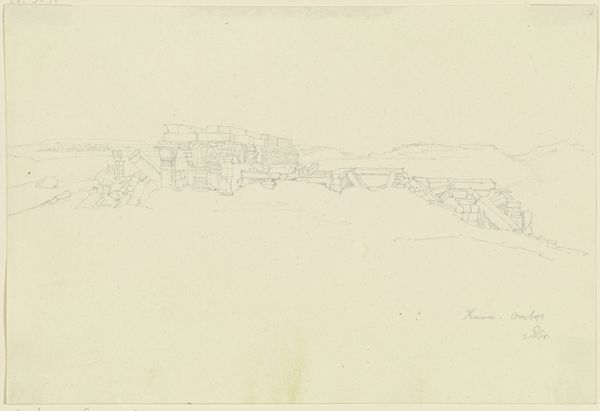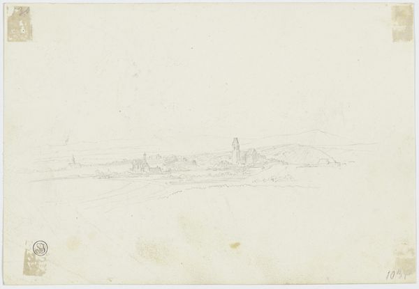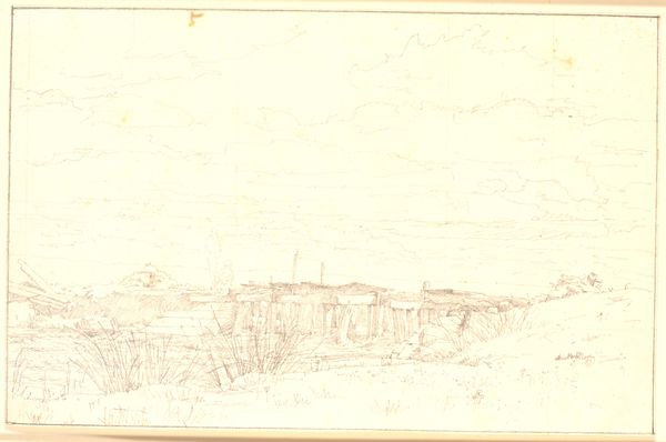 Curator: Martinus Rørbye’s 1836 pencil drawing, “Udsigt mod Akropolis”, offers us a delicate rendering of the Acropolis as viewed from afar. The artwork is currently held at the SMK, Statens Museum for Kunst. Editor: There’s an almost melancholic serenity to this drawing. It's incredibly sparse and light, giving the ruins an ethereal quality that hints at both grandeur and inevitable decay. Curator: I’m struck by the stark geometry of the Parthenon atop the hill—the clean lines of the architecture contrasting with the sloping land, showcasing Rørbye’s interest in Neoclassicism and Realism. The drawing beautifully exemplifies a mastery of perspective, achieved with a bare minimum of lines. Editor: But even those spare lines speak volumes, don’t they? The way the Acropolis is centered emphasizes its role as the birthplace of democracy and Western philosophy, things often inaccessible for some and flourished under systemic inequalities. There’s a weight to seeing that history laid bare in a simple drawing. Curator: Certainly, the work encourages us to consider its context in the history of European landscape art. The use of a monochrome palette enhances the architectural forms. It serves almost like an ode to the timelessness of classical structures in the pencil strokes themselves. Editor: Yes, and it makes me think about whose stories get preserved in these classical forms, literally sketched here. The fact that it’s a distant view reinforces a certain detached observation, maybe echoing the colonial gaze through which much of this history was and continues to be interpreted. Curator: It is intriguing how the bareness amplifies attention to detail, demanding an assessment of tonal balances and spatial interrelationships. Rørbye is inviting us to decipher meaning through pure form. Editor: In looking at Rørbye's gaze, I find myself considering who we exclude from narratives about heritage when we immortalize landmarks and histories through art. It invites reflection on how the dominant cultural narratives have influenced representations of these sites and communities tied to these very histories. Curator: A brilliant observation. This work remains a delicate encapsulation of form and, perhaps, a historical prompt too. Editor: Indeed, its quiet power lies in revealing how much history a simple scene can quietly hold.