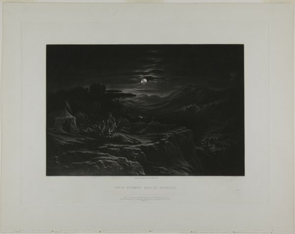 Curator: What a dramatic scene! Before us is "Joshua Commanding the Sun to Stand Still, from Illustrations of the Bible," a print etched by John Martin in 1835. It's currently part of the Art Institute of Chicago's collection. Editor: Whoa. It feels… apocalyptic. Everything’s swirling, chaotic, yet there's a kind of desperate energy in the figures below. You can almost feel the wind in your face just looking at this. Curator: Martin was fascinated by biblical events and their potential for grand symbolic representation. The halted sun here is a profound symbol of divine intervention, representing not just temporal power, but the very control of cosmic order to achieve victory. Editor: Right, that checks out. To me, it's the lighting that really grabs you. That central beam, illuminating the city...it’s as though it's singling out the righteous, in that old-school Romanticism kind of way. But also casting everything else into shadow. Are we supposed to cheer for Joshua, or question this kind of force? Curator: The Romantics certainly loved that interplay of light and dark, or "chiaroscuro" as the Italians would say, but on top of it, we might recognize something of the Sublime at play—an experience of awe mixed with terror, facing something beyond human comprehension or control. Editor: Exactly! That feeling of being dwarfed by something immense and, honestly, a bit scary, is so effective. And you have these tiny, tiny people huddled below as if in the path of an onrushing storm – a perfect reminder of the insignificance of mortals against a divine order, or some force of nature, depending on your view. Curator: The city in the background might represent the permanence that these mortals seek, contrasting it against the perceived ephemeral quality of human existence that these figures below are expressing in the form of anxiety. Editor: So good. I keep going back to those figures in the foreground... that urgency in their faces. The gesture upwards that pleads with what seems like a cloud deity of pure angry energy. Like, "Hey, uh, maybe ease up on the theatrics, alright?" I almost wish I could join their prayer! Curator: Looking closely at how Martin composed this scene certainly provides ample scope for considering how visual language transmits narratives, not merely illustrating but reinterpreting them. It shows us that visual symbols possess long duration. Editor: This image makes the hair on my neck stand up. Gives me lots to reflect upon, really appreciate you talking me through it.