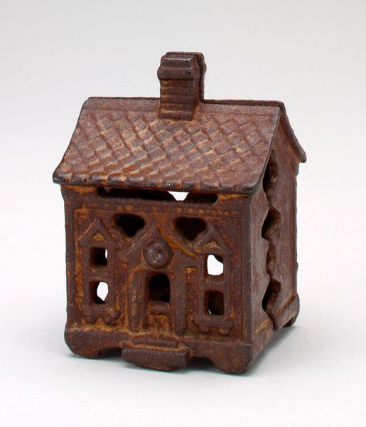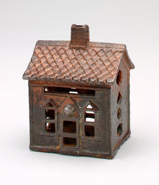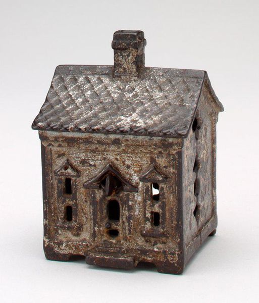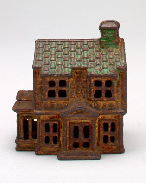Editor: Here we have the A.C. Williams Company’s "-Two-Car Garage- still bank" from the late 1920s, made of metal. It has such a quaint feel to it. I wonder about its cultural significance; it’s almost like a little monument to the burgeoning car culture. What do you see in it? Curator: Precisely. Notice the material – cast iron. Consider its production. It's not just an object, but evidence of the American industrial machine geared toward the aspirations of a growing middle class. The 'still bank' function is also key; it encourages saving, feeding into capitalist desires for ownership. Editor: I hadn’t really considered the function of saving money. That definitely contextualizes the piece differently. How would that relate to its status as folk art? Curator: The line is blurry, isn't it? Is it "high art"? No. But consider the labor involved in its creation. The repetitive casting, the hand-painted details. This was everyday work. Decorative arts reflect the skills of ordinary people adapting industrial processes, not necessarily expressing some higher artistic calling. The materials themselves – metal, paint – speak of accessibility, mass production, and ultimately, consumption. It’s not a unique sculpture but something replicable. Editor: That is so fascinating! The repetitive labor aspect highlights its relation to commodity culture and manufactured consumer desires of the time. Thanks for this perspective! Curator: Absolutely. Examining its making unravels its meaning; seeing art as a product as much as a reflection enriches understanding.