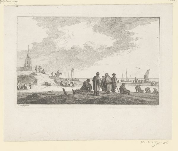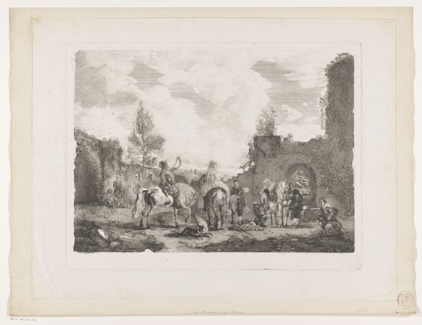 Curator: Before us is "Hunting Party by a Stream with a Neptune Fountain in the Background," an etching and engraving by Jean Moyreau, created sometime between 1733 and 1762. Editor: My first impression is one of aristocratic leisure—an elegantly disheveled tableau of humans, horses and hounds milling around as though posing for a portrait of refined disinterest. The whole composition breathes ease and privilege. Curator: Absolutely. And I find it fascinating to consider how this scene would have been constructed in the studio. An etching like this requires layers of work—the metal plate, the acids used for biting, the printing press itself…each step revealing a set of material conditions. Editor: Yet, that leisure you speak of also points toward established symbols of power. Consider that distant fountain, depicting Neptune, God of the Sea! What does that subtle placement mean, aside from reminding everyone about the master’s dominion, the ability to bend water—life itself—to his aesthetic will? Curator: The symbolism can certainly speak volumes, yet I also wonder about the more grounded realities. Think about the supply chain! The paper, the inks, the labor required. An army of often invisible workers and materials made this seemingly effortless scene a tangible reality. Editor: And tangible it is! But, I read this symbolic deployment as intentional messaging, deeply connected with contemporary values. Even the act of "hunting" held ritual importance as a practice accessible almost exclusively to the aristocracy, a demonstration of prowess and power sanctioned by tradition. The dogs become a tool to show the hunters power. Curator: Agreed. It is impossible to see that activity as outside those deeply held cultural values, particularly when you consider the Baroque fascination with elaborate displays and hierarchies. Each element in the composition speaks to very particular modes of production and the circulation of not just wealth, but power. Editor: So, on the surface we see an appealing slice of life from a specific time and place, but through this collaborative lens, it speaks more to cultural production, material practices, the role of classical iconography…it allows for complex levels of understanding. Curator: Precisely! Analyzing artwork in a multidisciplinary mode unveils historical narratives in profoundly engaging ways. Thank you for helping unpack such rich themes.