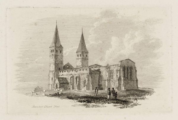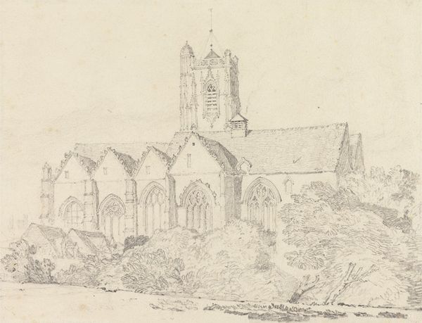 Curator: Let's delve into John Sell Cotman's "Douvres Church, Normandy," created around 1820. Cotman, as a painter associated with the Romantic style, captured this imposing medieval church using ink wash. Editor: Immediately, I’m struck by the composition—the formidable church dominating the scene, juxtaposed with the delicate ink lines. The contrast is stark. It communicates an immediate sense of grandeur, doesn't it? Curator: It does, and it's critical to place such architecture within its era. Religious architecture during the Romantic period symbolized far more than piety. Post-French Revolution, it acted as a stark reminder of power structures and the inherent inequality pervasive through the continent at this time. Editor: True, the very presence of such imposing structures reinforced social hierarchies. From a formal standpoint, the artist uses the height of the tower to further impose a top-down dynamic in the composition. What can be made from Cotman’s deliberate rendering in monochromatic values here? Curator: It speaks volumes! Color, which would denote individuality, expression, the everyday joys of life, is noticeably missing here. What we’re left with is bare structure – as the architecture shows – both stand bare as skeletal systems bereft of vivacious life, almost ghostly! Editor: Indeed, it emphasizes form and volume rather than details. There's an undeniable simplicity and purity in this focus on form; you can observe that through his economy of line and carefully applied washes. Curator: But the seemingly simple lines point towards societal strictures. The choice of leaving the tower looming over working men and women reinforces gender roles – what men built, women accepted. The weight of those walls is, after all, born most heavily by some members of the population, while many others were conveniently exempt. Editor: Yes, there is a certain inescapable truth. Cotman used lines and shading to create this imposing, almost austere scene. Yet, I'm curious about his choice to depict a dilapidated section, a ruin next to the pristine church. Curator: Precisely. That ruin highlights societal fractures. Power cannot be absolute, as we have often learned through painful moments of violence in history! Editor: Seeing it through the lens of both art and sociopolitical significance enriches our understanding of it, I believe. Thank you for shedding a little extra light on “Douvres Church, Normandy". Curator: My pleasure! Viewing artworks critically allows for the cultivation of deeper perspectives – not only on what used to be, but perhaps how we came to be!