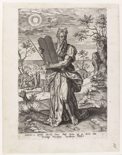 Curator: Here we have "St. Dominic Reading," an engraving crafted by Cornelis Cort in 1573, after a design by the artist Bartholomeus Spranger. This work, a product of the Northern Renaissance, is currently held at the Metropolitan Museum of Art. Editor: The initial impression is one of solemn introspection, don’t you think? The saint seems lost in his reading, enveloped by this dense forest. There's a stillness, almost a reverential quality, enhanced by the detailed landscape setting. Curator: Cort was a master printmaker, renowned for translating other artists' designs into highly detailed engravings. "St. Dominic Reading" reflects the artistic exchange of the time, moving ideas across Europe through print. Dominic himself, the founder of the Dominican Order, was a prominent figure during the Counter-Reformation, which profoundly impacted artistic production. Editor: Symbolically, the book is obvious, representing not just literacy but knowledge of the divine. What about the trees, so intimately framing Dominic? It’s tempting to read them as representing both the protective embrace of the Church, and perhaps the spiritual isolation sought by many religious figures. There is that rather angry-looking creature off to the side in the landscape though; not very serene. Curator: A good point about the creature, that winged being could be interpreted as a defeated representation of heresy, alluding to the Dominican Order's role in combating doctrinal deviations. Its presence emphasizes the power of St. Dominic's faith, encapsulated in his act of reading and intellectual pursuit. The placement within a natural setting could also highlight the period’s view of faith intertwined with understanding of the natural world. Editor: The light seems significant. Look how it catches the pages of the book and his face, while much of the landscape is in shadow. His knowledge is literally illuminating, yes? What would such imagery signify to viewers during that tumultuous period? Curator: I think it reinforces the idea of divine knowledge as a guiding light during times of religious and political conflict, assuring viewers of faith's capability to offer clarity amid confusion. Print media like this were carefully curated and controlled by different sides of religious movements to inspire public support and to provide examples of role models of the era. Editor: Considering the wealth of symbols woven into this engraving, it encourages us to delve deeper into how knowledge and spirituality were envisioned during a period of religious reformation. Curator: Exactly. Cort's rendering grants us a vivid understanding of the era’s socio-political dynamics. A simple portrait becomes an historical statement, skillfully translated into image.