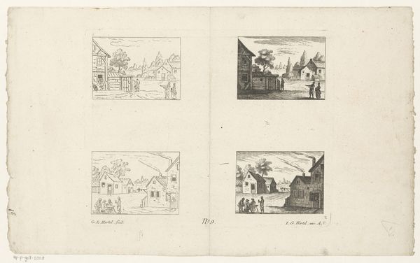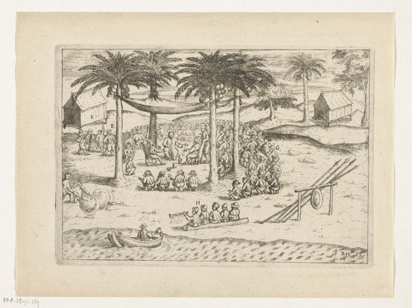 Editor: Here we have an engraving from the early 1600s, "Logement van Van Warwyck en Van Heemskerck op Bandaneira, 1599," made by an anonymous artist. The crisp lines depict a bustling scene, maybe even a little chaotic, taking place in what seems to be a tropical locale. What's your initial read on this image? Curator: It's a fascinating piece when considering the context of the Dutch Golden Age. This engraving visualizes a specific moment of early Dutch colonial activity, a key era in understanding Dutch national identity and its relationship with global trade. Editor: Can you tell me more about that? What aspects speak to colonial activity? Curator: Observe the implied power dynamic. We see Dutch officials seemingly observing local labor; this establishes a clear visual hierarchy. The tents are used for lodging while nutmeg harvesting takes place in the background, which also is significant as nutmeg fueled European expansion in that period. Editor: I see, the local workers outside. I’d assumed they were carrying things for trading or maybe part of some celebration. The officials inside do give off a sense of detached observation. Curator: Indeed. Now, consider the very act of creating and circulating this image. What public did it serve? How did this image shape the perception of the Dutch East India Company's activities back home? Editor: That's interesting. It could be interpreted as promoting their power and legitimizing the trade efforts…even if it was brutally harvested from locals? Curator: Precisely. It served a socio-political purpose, visually justifying and normalizing Dutch involvement in the Spice Islands. How do you view this print differently now, knowing its historical context? Editor: I think it shifts it from just a busy scene to a record – or rather, a constructed view – of a colonial encounter and really illustrates the problematic power dynamics at play. It makes me think a lot about the ethics of visual representation then and now.