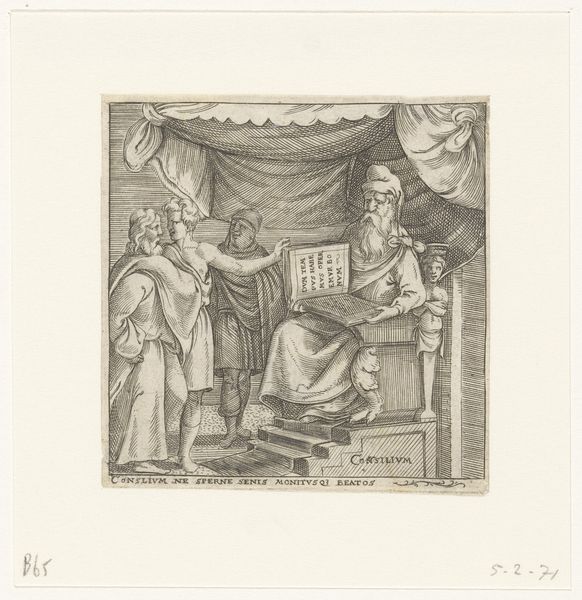 Curator: This intriguing artwork is titled "The Nativity," created in 1574 by Melchior Lorck. It’s a woodcut print. Editor: Immediately striking! It's as if the scene exists within a meticulously constructed architectural rendering, not quite as a warm, earthy space we would usually attribute to this tender scene. Curator: The "constructed" feel comes through in the lines, wouldn’t you say? There is a very specific style being adopted here, very precise, sharp edges defining the figures of Mary and Joseph. Editor: Absolutely. And what could this calculated geometry signal? Is it a reflection on power? Religion being constructed, regimented… men's hands at play, even in what's supposed to be divinely inspired, maternal territory? Curator: Intriguing perspective. Looking beyond the central figures to the background, a city rises beyond an opening in what might be a wall or structure. Do you interpret this inclusion as an assertion that something new is indeed born in contrast to this structured surrounding city? Editor: Indeed. It certainly feels as if a challenge is being put forward here; this child versus the urban, established order beyond. There's almost a deliberate juxtaposition occurring, a hint of political commentary about what this birth signifies for established social structures, no? Curator: It might be! Considering Lorck's background—traveling widely and being affiliated with various courts—this would track. A commentary embedded into what seems, on the surface, a purely religious scene. Editor: Which takes us away from seeing this as a simple representation of divinity. We have here an articulation of resistance, then? Or a subtle prodding at the era's social architecture? Curator: Perhaps. Food for thought as we wander away and reflect further. Editor: Precisely. An intricate, suggestive construction open to interpretation!