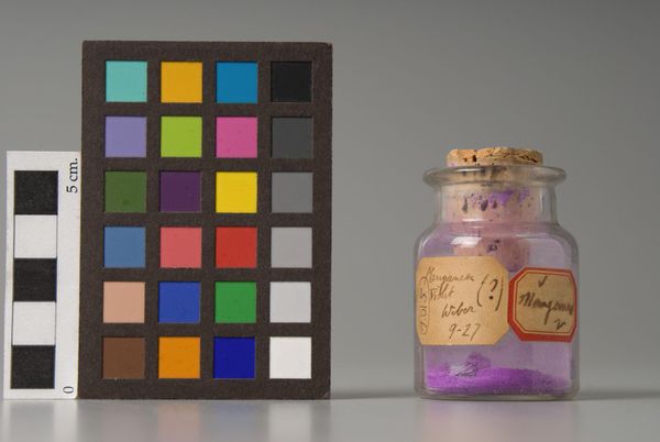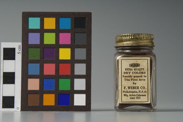 Editor: This is an image of a jar of dry pigment labeled "Dragon's Blood," manufactured by F. Weber & Company. The red powder hints at something mystical, almost alchemical. What visual symbols do you find most striking here? Curator: The name itself, "Dragon's Blood," evokes potent symbolism. Historically, dragon's blood referred to various red resins used in medicine and rituals, associated with power and vitality. Consider how the manufacturer leverages this ancient cultural memory to imbue a simple pigment with deeper meaning, connecting the artist to a lineage of symbolic practice. Editor: So, it's not just a color; it’s tapping into something much older and evocative. Curator: Precisely. The image functions almost as a modern-day reliquary, holding the promise of transformative potential within that small jar. It prompts us to consider the psychological weight we give to colors and materials. Editor: That gives me a completely new way of looking at it. Thank you. Curator: My pleasure. It’s a fascinating intersection of commerce, art, and cultural history.