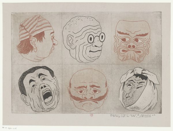 Curator: Here we have Henri-Charles Guérard's graphite drawing of a Japanese theater mask. It's from somewhere between 1856 and 1897, and it’s currently held here at the Rijksmuseum. Editor: Wow, it’s intense! Those empty eye sockets juxtaposed with that really exaggerated grin—it makes you wonder what emotion it’s supposed to evoke. There's almost a dark humor in the drawing's sharp contrasts. Curator: Absolutely! It likely represents a specific character in Noh theater, where masks like these serve a profound function. Noh drama often features spirits and demons, beings with complex natures. This mask, crafted of lacquered wood, speaks to an entire performative tradition, doesn't it? Think about how such a mask influences posture, vocal projection—the actor literally embodies the spirit it depicts. Editor: I immediately zeroed in on the lacquered wood itself, which suggests considerable labor went into its production. I mean, how many steps are involved? The carving of the wood, the careful layering of lacquer—not to mention the social function the mask served within its original community! It isn’t just art; it's cultural labor manifested into an object. Curator: Exactly. Masks aren’t passive objects. Across cultures, they symbolize transformation, hidden identities, ways to access different states of being. And within Japanese culture particularly, a theatrical mask links one generation of performers to the next. Its symbolism can be traced back centuries. Editor: And it begs the question—did Guérard appreciate all this when he chose to represent the mask in a drawing? Was he thinking about the original craftsmanship, its place within a larger industry of performance, or merely the mask’s visual properties? Curator: I suspect both. As a skilled artist, he'd undoubtedly respond to the formal qualities – the play of light on the lacquered surface, the expressive distortion of the features. But the act of copying itself can also be an act of cultural exchange, even appropriation. Editor: I hadn't thought of it that way. For me, knowing the mask's purpose is really interesting and enhances the caricature itself. The social relations embedded within this object’s story give the caricature added layers. Curator: For me, the enduring power of masks resides in their capacity to distill complex emotions and ideas into a single, potent image. It is striking to experience these deep symbols across different eras. Editor: Indeed. Thanks for shining a light on this very striking artwork.