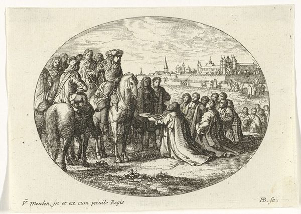 Curator: This engraving, attributed to Jan van Huchtenburg between 1674 and 1733, is called "Belegering van een stad door Lodewijk XIV, koning van Frankrijk," which translates to "Siege of a City by Louis XIV, King of France." Editor: It has the unmistakable formality of an official record, but beyond that, it strikes me as surprisingly static for a depiction of a siege. Curator: The imagery suggests the opposite of stillness, though. Notice how van Huchtenburg, like many artists of his time, uses the image of the king on horseback as a potent symbol. He's raised above the ordinary, chosen, almost divine. The city in the background becomes a prop, a stage for the performance of royal power. Editor: Perhaps. I see the static composition speaking more of production under constraints – a printed medium and all that entails. Engraving like this involved repetitive actions, division of labor, with different hands taking on landscape, figures, and lettering. So much rides on these processes. Curator: Of course. But consider the visual language! The formal portrait almost echoes other iconic representations of kings – of Alexander or Charlemagne—tapping into deeply rooted associations of leadership. It’s a way of encoding Louis XIV into a larger story, and solidifying the French monarchy's symbolic presence through time. Editor: I suppose there’s that layer of imposed meaning, the “history painting” aspect that reinforces an idea. But let's not forget the reality—the materiality—of such portrayals. The copperplate, the ink, the press: each contributing to a message that extends far beyond simple valor, hinting at a complex interplay of economy and technology underpinning the projection of royal might. Curator: Certainly. And the multiple, reproduced image then goes out into the world carrying all this cultural information, influencing perceptions of leadership and royal power…a powerful propaganda tool. Editor: Propaganda is tied to dissemination, after all. Well, reflecting on that mix of labor and symbols does enrich the work here. Curator: Agreed, seeing that intersection makes both the image and its legacy that much more meaningful.