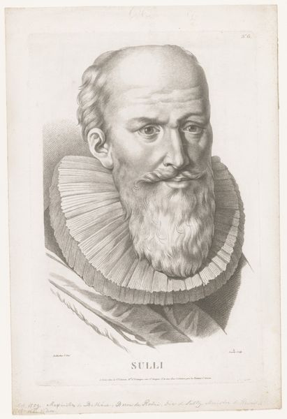 Curator: Immediately striking, isn't it? There’s a quiet authority emanating from this portrait. Editor: Yes, he looks formidable. The density of the line work—particularly in the clothing—gives him a very solid presence, a permanence. Curator: The work before us is Nicolas de Larmessin's 1682 engraving, "Portret van Fulvio Orsini," now held at the Rijksmuseum. Larmessin, of course, came from a family of renowned engravers, and this exemplifies his technical mastery. Orsini himself was a noted Italian humanist, scholar, and librarian for the powerful Farnese family. This image likely served a function in cultivating Orsini’s public persona. Editor: I immediately want to question whose gaze we are really meeting. The level of embellishment in his patterned coat contrasts rather interestingly with the plain backdrop and simple collar. The very visible baldness atop his head only serves to heighten a feeling of enforced masculinity through sartorial performance. Curator: Absolutely, dress and image played crucial roles in the construction of identity. Portraits such as these served a promotional purpose, asserting a person’s status and projecting an image they wished to convey to the world. This aligns directly with Baroque sensibilities that valorized grandeur. The details in the textures are truly superb when you consider this is achieved solely with line and negative space on a printed page. It certainly adds to his character, in a symbolic fashion. Editor: To me, I also see how portraits can serve a function of preservation or memorialization. Whose stories are these? Are there other portraits like this depicting lesser-known people from Orsini's life? What stories have been excluded in this seemingly neutral depiction of Renaissance Humanism? Curator: Those questions open critical pathways for examining historical power dynamics encoded within portraiture, no doubt. Ultimately, engravings such as these provide access into elite circles of Baroque Europe while showcasing exceptional artistry and design in the medium. Editor: And remind us to think critically about the stories art leaves out and the potential that still exists in examining a subject, an engraver, and an artwork within our own context.