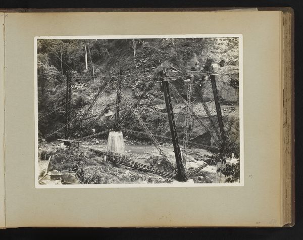 This black and white photograph, titled 'Spoorburg over de Ci Somang in aanbouw' of a bridge under construction, is found in the archive of the Rijksmuseum. The image has this fantastic quality, almost like a drawing, perhaps a study or a plan. The linear scaffolding reaches skyward from the rough-hewn excavation in the landscape, the geometry offering a sharp contrast to the grainy hillside. I’m struck by the way the anonymous photographer, in capturing this construction site, seems to be reaching for an understanding of the process of the bridge-building. It reminds me of that feeling of seeing a drawing where you can literally feel the artist working through something. Think of Bernd and Hilla Becher's documentation of industrial structures, but with a raw, immediate feel. The photograph embraces imperfection, and through it, reveals something profound about human endeavor. It’s a testament to the beauty found in the act of making.