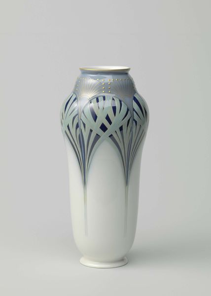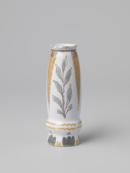 Editor: Standing before us is an earthenware vase—artist unknown—estimated to have been crafted between 1700 and 1725. What strikes me is its delicate floral patterning, which gives the object this wonderful sense of playful refinement. It feels like a springtime dance frozen in porcelain. What do you see in this piece? Curator: You’ve hit on something really key there—that sense of frozen animation. I see echoes of a world in transition. The vase screams 'desire' – a longing for exotic lands, filtered through a distinctly European lens. It reminds me of a meticulously crafted stage set, all orientalist fantasy. Tell me, does that shaped panel design at the top speak to you in any way? Editor: Absolutely. The contrast between the geometric shapes and free-flowing flower sprays gives a vibrant sense of organised chaos that makes the vessel even more captivating, and a tiny bit unsettling? Curator: Yes, 'unsettling' is a good word. It reflects the spirit of the age – a push and pull between order and the intoxicating allure of the unknown. Think about the trade routes, the flow of goods and ideas. Those flowers, so precisely rendered, speak of control, possession. What does it all amount to? What does this visual conversation with the East mean, really? Does it even attempt real understanding? Editor: This conversation has shifted my view entirely; from spring dance to a colonial power play depicted on painted earthenware. What does a modern viewer do with that? Curator: It invites us to reflect on how our perceptions of beauty are entangled with complex historical narratives. Sometimes, the most beautiful objects have the most challenging stories to tell.