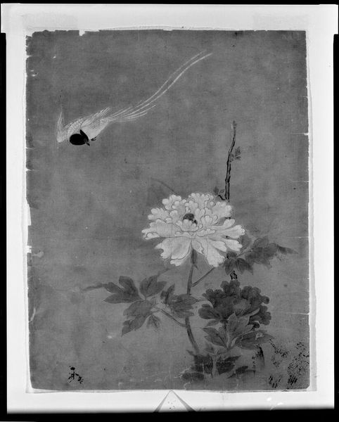 This delicate painting of bellflower, made by an artist from the Hokusai School, uses ink and color on paper. The materials themselves are fairly straightforward, but the way they're handled here is what gives the work its distinctive feel. Notice how the ink has been applied with incredible subtlety. The artist has exploited the inherent qualities of the ink, allowing it to bleed and blend, creating soft, ephemeral forms. The brushstrokes are minimal, yet they convey a remarkable sense of volume and texture. The paper itself plays a role too, its absorbent surface interacting with the ink to create nuanced tonal variations. This kind of ink painting has a rich history, deeply intertwined with traditions of calligraphy and meditative practice. It's not just about depicting a subject, but about capturing its essence through skillful manipulation of materials. Ultimately, this work reminds us that the most profound artistic statements can often be made with the simplest of means.