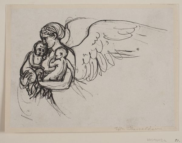 This is H.P. Hansen's illustration for Hans Christian Andersen's tale "The Angel." The black lines etched on this small, rectangular plate create a composition that evokes a sense of ethereal peace. An angel, draped in flowing robes, cradles a child, and a small bouquet of flowers, all rendered in delicate detail. Hansen's use of line is particularly striking. He employs hatching and cross-hatching to create tonal variations, building volume and texture in the figures and the angel's wings. Notice how the lines create a sense of movement in the clouds beneath the figures, contrasting with the stillness of the angel’s face. The simplicity of the etched line, combined with the subject matter, invites us to consider the semiotic weight of these symbols. Angels often represent guidance and comfort, whilst a child may embody innocence and purity. Together, they may challenge fixed notions, presenting a poignant image of care and protection. Through form and composition, Hansen visualizes a moment of profound tenderness, inviting endless interpretation.