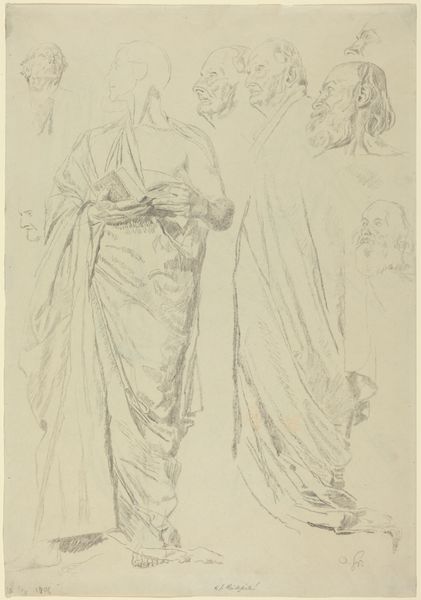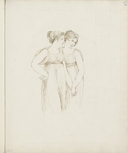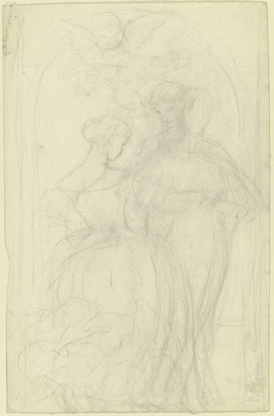Curator: Let’s begin with this sketch, "Figures for 'Dido and Anna'" by Washington Allston, found at Harvard Art Museums. What do you find most striking about it, right off the bat? Editor: The figures seem so melancholic and ethereal, as if caught between worlds. I'm curious, what story do you think Allston is trying to tell here? Curator: It feels like we are eavesdropping on a moment of quiet introspection, doesn't it? Given the title, we can assume he's playing with the tragic tale of Dido and Anna, exploring themes of love, loss, and betrayal. But consider too: are these figures fully realized, or are they whispers of ideas still forming? Editor: I see what you mean. It is the kind of art that invites us into the creative process itself. Curator: Precisely! It's less about a finished product and more about a glimpse into the artist’s mind, those fleeting moments of inspiration. A dance of pencil on paper, a beautiful invitation. Editor: That's fascinating, I had not considered that angle. Curator: It makes you wonder what other stories lie beneath the surface, doesn’t it?