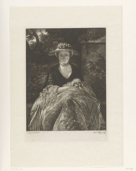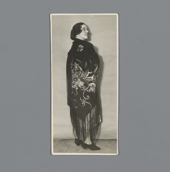 Curator: Here we have an arresting photograph titled "Model met geborduurde omslagdoek, model 'vogel', van de Wiener Werkstätte," placing it sometime between 1920 and 1930. Editor: My eye is immediately drawn to the cloak itself. It seems so heavy, so laden with… longing. And what’s underneath appears deliberately concealed. Is the figure retreating, or preparing for flight? Curator: The bird motif in the embroidery could certainly symbolize aspirations towards freedom. The Wiener Werkstätte, you see, sought a synthesis of the arts and crafts. Everyday objects infused with artistry. And the cloak, more than simple adornment, might suggest social codes, perhaps veiled expressions of identity. Editor: Social codes? Absolutely! A signal of wealth for one. I also note how the artist decided to portray the model from behind; an intentional choice, creating a beautiful tableau and hiding a personality. I'd be more than a little nervous of this model, like some dark queen holding court! Curator: Quite right. While we see the fashionable accessories of the time – a sleek head covering, shoes with just a hint of shine – the absence of the face encourages the viewer to reflect on artifice, design, and the roles clothing performs in projecting an image. Symbolism is always present in clothes but not necessarily overt. Editor: You are right. Her clothes, heavy on dark colour with stark embellishments, almost give her a haunting air... The contrast between the heavy black cloak and its silver decorations against an almost ghostly background, it’s a scene ripped straight from a psychological drama. You almost pity her, standing so stiffly as if posing is all she has left. It really speaks to how we see our public persona. The contrast with her intimate private life may differ vastly. Curator: It seems fair to suggest that while celebrating innovative design, this image also provides an intriguing reflection on constructed personas, an echo from a past world, that speaks of how clothes form who we wish to become. Editor: Indeed, a delicate balance struck between craftsmanship and emotional weight, I will take away, how the simplest image can hide complex characters within it.