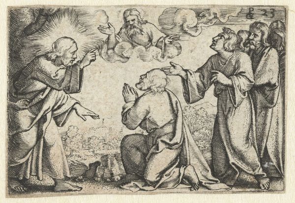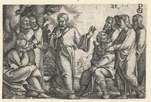 Georg Pencz made this print, Christus Speaks with the Disciples about the Good Shepherd, with engraving sometime between 1500 and 1550. Pencz was part of a generation of German artists who were deeply influenced by the Italian Renaissance and its revival of classical art and philosophy. The scene depicts Jesus explaining the parable of the Good Shepherd to his disciples, emphasizing care and protection of his followers. The small scale of the print speaks to its function as a private devotional object. The setting is somewhat generic but the landscape elements, with the naked figure by the tree, recall classical themes of the pastoral. This is where Pencz's interest in Italian art is evident. To understand more about the cultural context, consider the role of religious imagery in the 16th century, the history of devotional prints, and the influence of the reformation in Germany. These contextual factors can reveal much about the print's intended audience and its potential social functions.