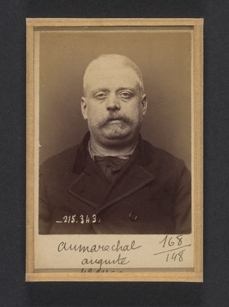 Editor: Here we have Alphonse Bertillon’s gelatin silver print, “Recco. Grégroire. 35 ans, né à Formia (Italie). Tailleur d'habits. Anarchiste. 11/3/94,” made in 1894. What strikes me immediately is how this portrait of an individual feels like it's trying to tell a much larger story. How do you see this piece operating within a broader historical or social context? Curator: This photograph is a part of Bertillon's larger project of criminal identification, which revolutionized policing in late 19th-century France. The work offers a chilling glimpse into the relationship between power, knowledge, and the individual, operating within a system seeking to control and classify. The neutrality of the subject’s pose, and the detached tone of the annotations below, aren’t arbitrary. The subject, an Italian anarchist, is transformed into a data point within a larger system of surveillance and control. What does the explicit labeling of his profession and political leanings tell us about how "criminals" were classified at the time? Editor: That's fascinating, and it gives the image such a different weight. I initially just saw a portrait, but now I realize that it's about institutional power too. Does his classification, tailor, anarchist, predispose him to accusations or guilty verdicts within the context of French society at the time? Curator: Exactly. It highlights how "objective" systems of identification are never truly neutral, and can become tools of social control and discrimination. Looking at Bertillon's mugshots we must ask ourselves whose stories are never told, or are intentionally misrepresented. This isn't just a portrait; it's a document reflecting social and political anxieties of the time. Editor: I hadn't considered that. Thanks for illuminating the deeper context embedded in this photograph!