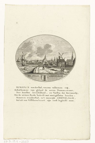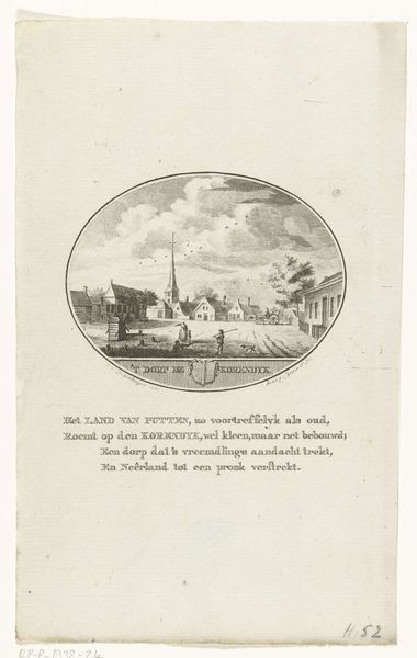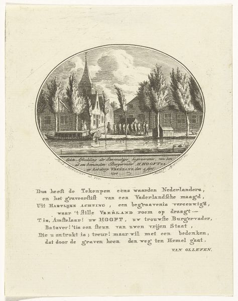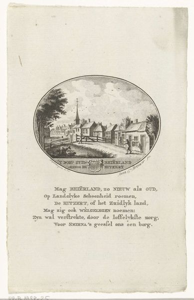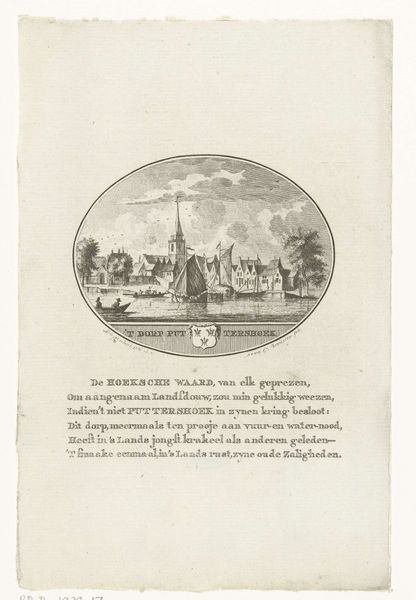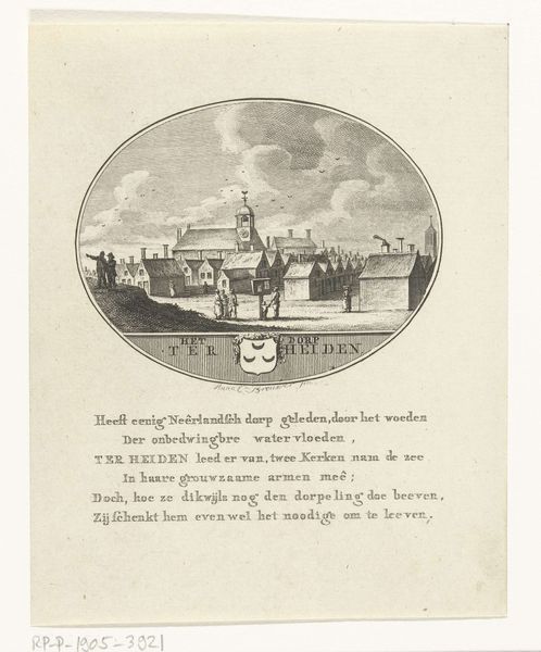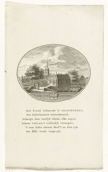 Curator: Welcome. We're standing before "Gezicht op het dorp Zwijndrecht," or "View of the Village of Zwijndrecht." This engraving, dating from between 1791 and 1793, comes to us from the hand of Anna Catharina Brouwer, and it's held here at the Rijksmuseum. Editor: My first impression is of its charming simplicity. The fine lines create a sense of tranquility and order; it’s a beautifully balanced composition, contained within this oval shape, focusing the eye. Curator: Indeed. Brouwer produced this engraving in a period rife with social and political tension, especially in the Dutch Republic. Cityscapes like this often served not just as depictions, but also as statements about local pride and perhaps even veiled political commentary during times of upheaval. Editor: The technique of engraving allows for incredible detail, doesn't it? Look at the textures of the buildings and the reflections in the water, rendered through nothing but tiny, precise lines. The symmetry in the composition, bisected by the waterline and echoed in the clouds above, adds to its calming effect. Curator: Absolutely. These depictions became popular during the era, becoming both records and promotional tools. They celebrated the Dutch countryside. The almost stylized rendering may speak to an intentional simplification. We must also recall that such pieces would often circulate among specific social circles, perhaps reinforcing existing hierarchies and notions of regional identity. Editor: I agree, the idealized representation removes the potential chaos and grit of daily life in favor of harmony. There’s an emphasis on structure that can't be missed, even when we lack context on what it tries to hide. It all seems quite contained and orderly; the buildings, water, and sky each have their respective visual space. Curator: Ultimately, I view this engraving as a valuable window into a specific moment, showing us not just what Zwijndrecht looked like but also what its inhabitants, and perhaps the ruling elite, wanted it to represent. Editor: For me, the pure formality and skillful artistry allows a pause. It brings attention to simple subjects in a beautiful way.