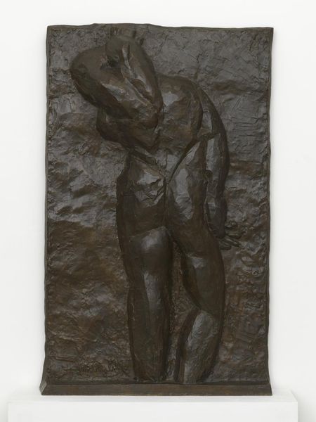 Editor: So, this is Matisse's "Back III," a bronze relief sculpture. The texture is so rugged, almost violent, yet the figure itself seems calm. What do you make of the interplay between form and surface? Curator: Note how the artist articulates depth. The planes are compressed. Observe the tension between the figure's mass and the flatness of the background. How does the restricted palette influence your perception of form? Editor: It really emphasizes the sculptural aspect. I see how the texture creates shadows that define the figure. Curator: Precisely. It's a powerful demonstration of how formal elements can convey meaning. Editor: I now understand how the materiality amplifies the power of the subject.