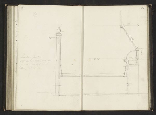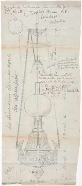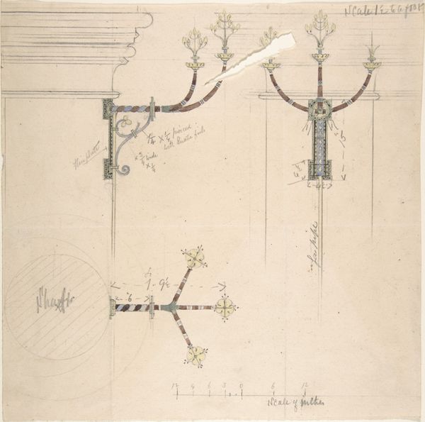 Editor: This is "Design for a Cross Supported by Lead Roof Cap, for Belleaw Church" from 1875-1885 by Richardson Ellson & Co. It's a mixed-media drawing, incorporating watercolor and etching. The drawing style feels both technical and quite elegant. What do you see in this piece? Curator: I see a powerful intersection of faith and architectural ambition, deeply rooted in the cultural memory of the Gothic Revival. The cross itself, rendered with such precise detail, isn’t just a symbol, but a structural element, laden with centuries of Christian symbolism adapting into modern innovation. The lead roof cap grounds the ethereal aspirations of the cross. Have you considered how this juxtaposition reflects the societal tensions between tradition and modernity during that period? Editor: That's fascinating! I hadn't really thought about the roof cap as this grounding force, more like just part of the design. So, the choice of materials is significant, as well as the cross design? Curator: Precisely. The etching combined with watercolor suggests a yearning for the past and industrial progress. Note the detailing and the technical script, mimicking manuscript, coexisting. What emotions does this clash evoke? It evokes how people at the time interpreted history in contrast with their then modern experience. Editor: A tension, definitely. Maybe a reaching for stability in faith while embracing new technologies? Thanks, that gives me a much deeper understanding! Curator: Exactly, and remember, these symbols evolve, resonating differently with each generation. Always consider the historical context, but trust your intuition. The symbols always evolve into something meaningful.