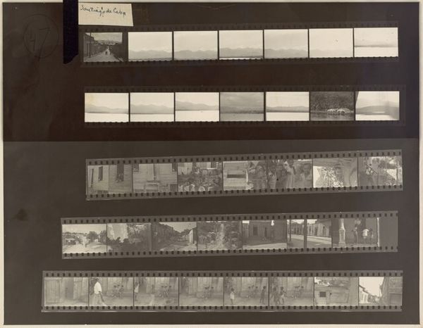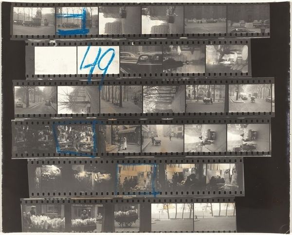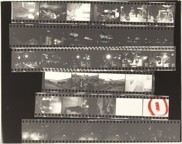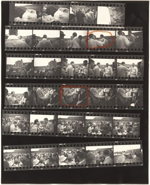 Curator: Robert Frank’s contact print, "Nixon campaign 28," created in 1960, presents a raw and revealing look into a political campaign. The imagery feels especially significant when considering how photojournalism evolved through figures such as Frank in this era. What are your initial thoughts on this piece? Editor: Bleak, I suppose, would be the first word that comes to mind. The tight, almost claustrophobic compositions. I get this immediate sense of manufactured optimism… like everyone is trying too hard to smile, especially Nixon, who seems to be forcing it in every shot. Curator: That sense of forced optimism definitely speaks to the way political images are often carefully constructed for public consumption. It makes me think of the broader context: the 1960s were a time of huge social and political change, and the media's role in shaping perceptions was becoming increasingly significant. Editor: And Frank, he seemed intent on unmasking all that artifice, right? Look at these gritty, high-contrast images. This isn't the polished, airbrushed politician we are used to seeing. It feels closer to cinéma vérité in its rawness—it feels unscripted. Curator: Precisely! This is documentary photography veering towards an intentional subjectivity. It really challenges the perceived neutrality that had long been associated with photojournalism. In using contact prints, he further highlights the artist's process, the selection, and therefore his judgment. Editor: Right! I see so much storytelling in the choice of images here. These fragments almost mimic memory, these blurred visions. So many shadowy figures populate the backdrop—but do they have any actual substance or are they stage props? I am left wondering… Curator: Those visual textures, the almost accidental framing... This reflects a deliberate shift away from idealized representations towards a more ambiguous portrayal of political life. The imagery becomes imbued with his critical perspective, reflecting widespread disillusionment. Editor: Looking back, that critical eye of Frank felt groundbreaking in so many respects. And I imagine it had a real impact in helping shape a more wary or sophisticated kind of viewer, perhaps for the worse, maybe better! Curator: Exactly. His contributions have made lasting impact in how we consume political imagery to this very day. Thank you for sharing your thoughts.