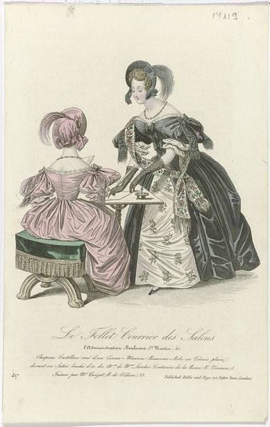 This is an 1835 fashion plate titled "Le Follet Courrier des Salons" whose artist is anonymous. The lithograph presents two women in grand dresses, emphasizing the exaggerated silhouettes fashionable at the time. The composition balances detailed ornamentation with the stark geometry of the floor. This contrast creates a visual tension, drawing our eyes to the women's attire. The color palette is subdued, dominated by off-whites and pale greens. These colors lend the image an air of restrained elegance, while the dynamic lines of the dresses suggest movement and volume. Considered through a semiotic lens, each element functions as a signifier. The elaborate dresses signal wealth and status, while the act of reading and exchanging letters hints at social intrigue. This artwork encapsulates the visual and cultural codes of its time. The print highlights the performative aspects of fashion and the silent language of social exchange.