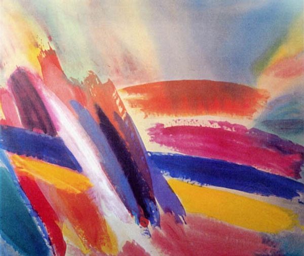 Editor: Karl Wiener’s “Adagio,” created around 1928, strikes me as a fascinating exploration of color. It’s a watercolor painting, and the washes of color create a really soft and almost musical feel. What can you tell me about it? Curator: The title "Adagio" itself suggests a connection to music, implying a slow, graceful movement. The early 20th century witnessed a significant cross-pollination between the arts, with artists like Wiener exploring visual equivalents of musical concepts. Considering the rise of abstract art and expressionism, what political and social conditions were influencing artistic expression at this time? Editor: I guess a lot of artists were questioning traditional forms due to the World War One. It challenged existing structures and values. Did that impact the art world’s perception of pieces like this? Curator: Absolutely. The trauma of war led many to reject traditional representational art. Abstract art became a powerful tool to express complex emotions and explore new realities. Museums and galleries, then, played a vital role in legitimizing these avant-garde movements by exhibiting and promoting them. Think about how different this is from the Realism movement, where a political stand was displayed through depiction of actual events. Editor: That’s really interesting! So, museums weren’t just display spaces, they were actively shaping what was considered valuable art? Curator: Precisely! Art institutions held considerable power in dictating taste and canonizing artists. The rise of modernism and abstraction wasn't a natural, inevitable progression, but rather a result of complex negotiations between artists, critics, collectors, and institutions. And understanding this history, helps us better see how those decisions still echo today in which artists, movements, and works become canonical. Editor: I never thought of it that way, that art is shaped as much by politics as expression. Thanks for shining some light on this artwork!
