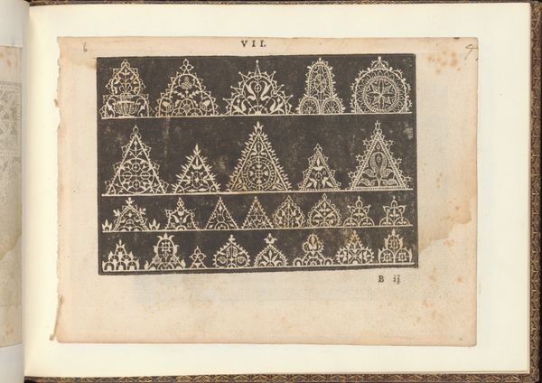 Curator: This delicate print, dating back to 1591, is a page from "Prima Parte de' Fiori, e Disegni di varie sorti di Ricami Moderni" by Giovanni Battista Ciotti. The image, rendered as an intaglio print, features a series of intricate lace designs. Editor: Immediately, I'm struck by the repetition of geometric shapes. The triangles and other symmetrical figures almost seem to vibrate against the dark background, don't they? Curator: They do. It's fascinating to consider this page within its broader social context. Lace-making was a significant industry at the time, a painstaking manual labor, largely performed by women. This book was designed to provide patterns and stimulate creativity. Editor: Precisely! Look closely and you'll see each design presents a unique iconographic program. A repeated symbol such as the fleur-de-lis becomes abstracted in some examples while staying grounded in its familiar form in others. Curator: Absolutely, while each individual element could be imbued with symbolic meaning depending on its cultural context, consider that the book itself played a practical role, functioning almost like a modern pattern book. Each impression of the page involves a process of labor. Editor: The designs vary so much, from the strictly symmetrical and contained triangles to those with organic, floral-inspired flourishes that nearly overflow. It's a dialogue between order and nature, isn’t it? And what does that tell us about Renaissance ideals of beauty? Curator: I'm drawn to how this print simplifies the original act of creation. It highlights how such designs, regardless of the specific symbol system involved, are still bound by technical considerations during production. The quality of the impression matters to the person employing the pattern. Editor: Looking at it this way, I can also see that it isn't just an exercise in aesthetics, but also an exercise in psychology. By reproducing specific figures across different arrangements, what response do the image's creators or eventual users hope to trigger in the eye and the mind? Curator: In the end, this isn’t simply a collection of lace patterns; it represents countless hours of labor. It’s an imprint of a historical process—both creative and productive. Editor: Yes, it’s an intimate glimpse into the way patterns speak across generations. Each form in "Prima Parte" offers a rich and continuous dialogue with our cultural memory.