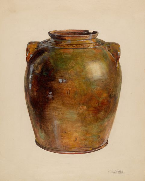 Curator: Isn't it charming? It's Ethelbert Brown's watercolor, "Pa. German Jar with Lid," created around 1941. A sweet, unassuming rendering, really. Editor: It certainly is unassuming. I'm struck by its quiet domesticity, almost bordering on melancholy. The muted tones and centered composition lend it a stillness, as if the jar itself is holding its breath. Curator: I find that really perceptive. It does capture a sense of stillness, of quiet, maybe even resilience. These utilitarian objects, you know, they carried so much history, family history, communal history. This could be the pickle jar for generations. Imagine what secrets it holds? Editor: Absolutely. This seemingly simple jar becomes a vessel, a repository not just for food, but also for memory and tradition. I'm curious about the context of "Pa. German." That refers to the Pennsylvania Dutch, descendants of German-speaking immigrants, right? And their material culture, including pottery like this, was deeply connected to their identity and resistance to assimilation. Curator: Precisely. These objects were cultural touchstones. The form, the decoration—it all spoke to a heritage they were determined to maintain. And note the little flourishes; the year 1818 inscribed on one side and what looks like the name "Harmi" etched onto it. A reminder that behind every practical piece, there is human intention, personal stories woven in. The artist almost acts as a historian here, immortalizing a vessel with cultural significance. Editor: It really invites questions about use, about ownership, about labor, who fired this, whose table did it sit upon? Whose hands reached inside, for what provisions? This is an act of remembering through craft and artistry. Beyond the surface beauty there's an implied narrative, dense and intimate. The choice of watercolor feels deliberate; a medium that can be simultaneously transparent and rich, fragile and enduring – like the histories it represents. It prompts us to contemplate the politics inherent in everyday objects and to consider their symbolic significance. Curator: You're right, it's deeper than just a pretty jar. It speaks volumes about cultural identity and historical preservation. Thank you for sharing your take! It’s given me much food for thought. Editor: And thank you, too. It’s amazing what we can unearth from such an unassuming subject. It speaks volumes, this jar, if you let it.