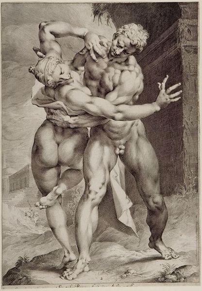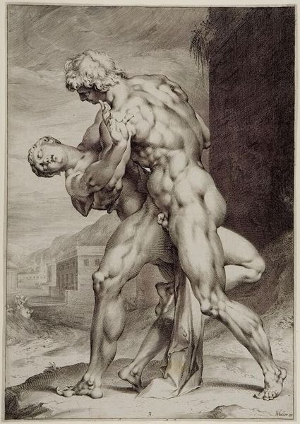 This is Jan Harmensz. Muller’s engraving, made in the late 16th or early 17th century, of a Roman abducting a Sabine woman. The print depicts a scene from Roman history that was often mined for its dramatic and symbolic content. As the story goes, Romulus, the founder of Rome, populated his new city with men but struggled to find wives for them. He invited the neighboring Sabine people to a festival, and while they were distracted, the Romans abducted the Sabine women. Muller's image, made in the Netherlands, presents a vision of the classical past that is both idealized and violent. The muscular figures, rendered with great attention to anatomical detail, recall the traditions of classical sculpture, revived in the Renaissance. The image is not just an illustration of a historical event, but also a reflection on the nature of power, desire, and the founding of civilizations. To understand this print fully, we might turn to historical texts describing the event, and contemporary interpretations of it, to understand the image’s place in the visual culture of its time.