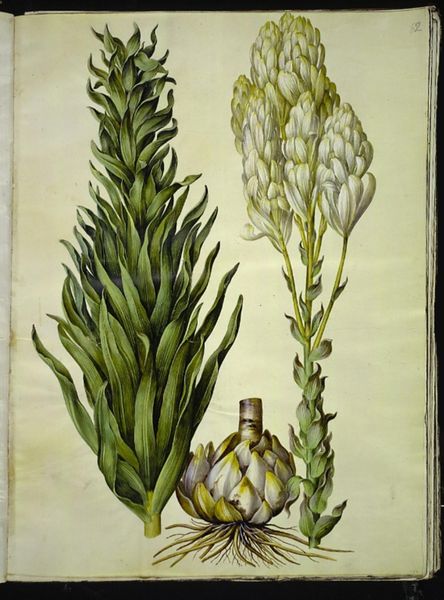 Hans Simon Holtzbecker painted this Yucca gloriosa in the 17th century, likely using watercolor or gouache on paper. These were common materials for botanical illustration at the time. The plant's form, with its radiating leaves and towering inflorescence, is meticulously rendered. The artist has skillfully captured the plant's texture, weight, color, and form. Holtzbecker would have been trained in the precise techniques of observation and representation. This was a highly valued skill in a time when botanical knowledge was crucial for medicine and trade. Such detailed illustrations served scientific purposes but also reflected the growing interest in natural history among wealthy patrons. They commissioned artists to document exotic plants brought back from expeditions, fueling a culture of collecting and display. The immense amount of labor involved in these images elevated their status beyond mere scientific record, blurring the lines between craft, science, and art. Ultimately, understanding the materials, processes, and social context is key to appreciating the complexity and value of such botanical artworks.