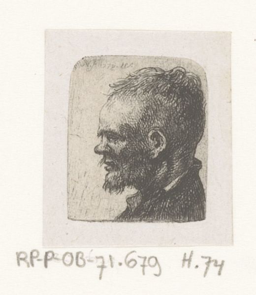 Jean-Pierre Norblin de la Gourdaine created this etching, "Buste van man met krullend haar en kalot," using a technique that emphasizes line and texture. The subject, a man with curly hair and a cap, is rendered through dense networks of fine lines, a visual effect that creates a sense of depth and volume. The composition is structured around the play of light and shadow, achieved through the strategic layering of etched lines. This use of light not only defines the man's features but also adds an emotional depth, inviting viewers to contemplate his character and story. The texture of the hair and clothing is meticulously captured, contributing to a lifelike quality despite the monochromatic medium. Norblin's technique functions within the broader discourse of printmaking, which values the interplay between mechanical reproduction and artistic expression. The etching process, with its reliance on line and tonal variation, is a semiotic system communicating ideas about identity and representation. This work challenges fixed meanings by presenting a portrait that is both detailed and enigmatic, open to interpretation and re-interpretation.
