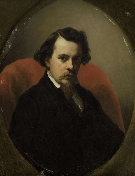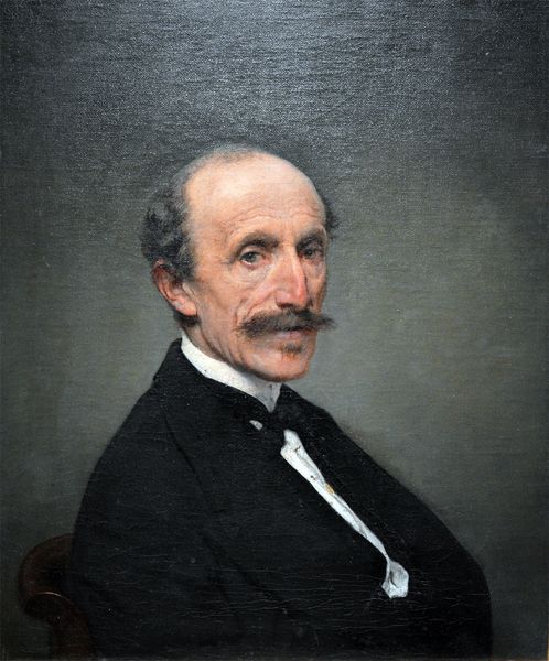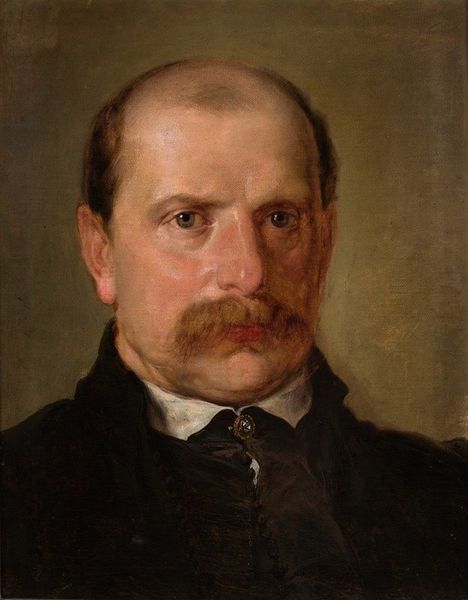 Curator: Before us, we see the “Self-Portrait” by Johann Georg Schwartze, completed in 1869 using oil paint. Editor: Well, hello there! My first thought? A slightly melancholic accountant who moonlights as a poet. The eyes hold a story, even if the background keeps it closely guarded. Curator: It's fascinating how you see the melancholic – the use of muted colors definitely contributes. What strikes me are those piercing eyes; in the history of portraiture, the eyes are a key indicator. Notice anything familiar in that gaze? Editor: Totally! I feel like I've seen him sipping absinthe at a dimly lit Parisian café. But seriously, those eyes…they're like, "I know something you don't know," aren't they? Almost feels like he’s gazing directly into the future. What’s the feeling in relation to the artistic traditions of that period, I wonder? Curator: The mid-19th century witnessed the burgeoning of self-portraits, with artists increasingly turning inward, trying to capture not just likeness but also psychological depth. Look closely: despite the darkness, there's meticulous detail in his mustache, a very strong detail in that self-image. Editor: Oh, the mustache deserves its own wing in a museum! It is fantastic! Seriously though, I love how he plays with light and shadow; the dramatic contrast enhances that feeling of introspective solitude. Makes you wonder what was swirling in his mind during that time, doesn’t it? Curator: Indeed. Romanticism valued emotion and individualism highly, so those visual cues might lead us into this painting as something beyond the mere depiction of appearance. Think about the very act of creating a self-portrait - the artist as both subject and creator, exploring identity...it's incredibly loaded. Editor: I am with you on that. It’s as if he’s handing us a piece of himself, vulnerable but poised. Makes you question your own sense of self. Beautiful and unsettling. I think I need to sit with him a bit longer and decipher a little bit more. Curator: I agree. And maybe next time we should consider how his "Romantic" image may have served the function of elevating his profession at that time... fascinating, nonetheless.