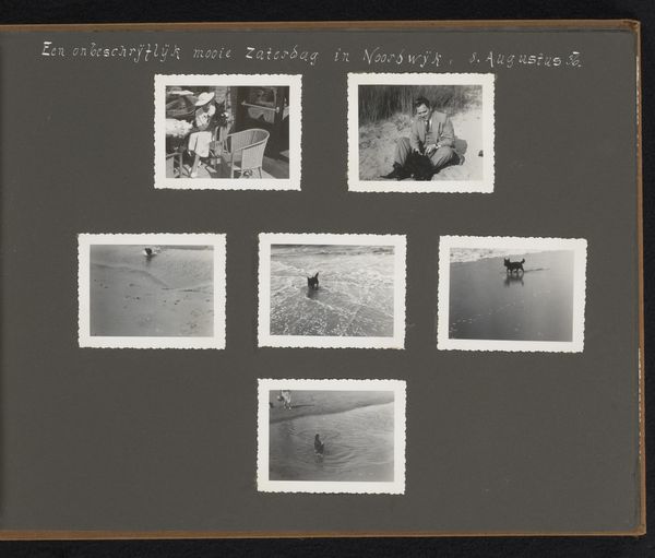 Editor: We're looking at "Landschappen te Rotterdam en de hond Bessie," made in 1939 by Herman Besselaar. It is a gelatin-silver print presented in a scrapbook. The presentation as a collection strikes me, like a visual diary capturing mundane landscapes and some rather charming animals. How might we unpack Besselaar’s compositional choices here? Curator: Indeed. Note the repeated geometric structure—the photographs are arranged within the album page in a rigid grid. Consider the formal properties of the gelatin-silver print: the stark contrasts, the limited tonal range. These choices create a certain austerity, a formal distance from the subject matter. Is this distancing a deliberate strategy, perhaps a way to observe the world with a cool detachment? Editor: That’s an interesting idea. I see how the repetitive format and limited tonal range create that sense of detachment, even with something as inherently charming as the dog, Bessie, or even the pastoral scene with the deer. How much do you think that repeated form impacts our understanding of the artist? Curator: The repetition, to me, establishes a system, a method of seeing and recording. Each photograph becomes a unit within a larger whole. It asks us to look beyond the individual image and consider the relationships between them. How do the landscapes inform the portraits of the animals, and vice versa? Editor: I hadn't considered that relationship before! Looking again, the geometric order almost feels like a controlled environment, imposing order on potentially sentimental subjects. This has given me a new appreciation for what might seem like simple snapshots at first glance. Curator: Precisely! It's in that tension between the intimate subject matter and the formal constraints that the work achieves its power. There's always a push and pull of geometric vs natural form here. Editor: Thank you. I’ll never look at someone’s snapshots in quite the same way.