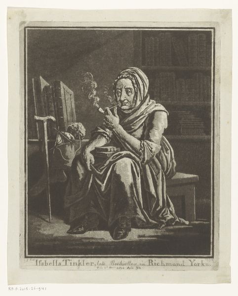 Curator: Looking at this print, "The Old Woman; from the Office of The Count of Vence," made sometime between 1782 and 1797 by Pierre François Basan, I'm immediately struck by how stark it is. The textures of the clothing, the shadows in the room… It speaks to the Baroque style and the themes found in genre painting from this time. Editor: The austerity certainly sets a tone. The image really conveys a weariness, the weight of years, visible in the posture of the subject. Even in reproduction, the image pulls me into her narrative. Curator: Absolutely, the engraving work helps amplify this emotional landscape. Here we see her holding a cane, a symbol of aging, or infirmity. You see the wear in her face, and then your eyes goes to this odd table setup. Editor: That table! The setup gives such a lived-in quality to the space, but beyond pure aesthetic pleasure, I can’t help but wonder about her access to resources, care, and dignity. Who gets seen, and how are they rendered? Is she representative of a broader social truth? Curator: The artist produced prints for collectors. The inclusion in "The Office of the Count of Vence" implies an elite audience consuming images of the lower classes. It raises the issue of how this artwork performs a certain kind of looking. What does it mean to see her depicted in this fashion for leisure? Editor: Exactly, so it's more than just genre-painting, we have to look at the power dynamics here. Are we invited to empathize, or to simply observe a specimen of poverty and aging for our own amusement or moralizing purposes? Curator: It's a complex question, with answers steeped in the social and political hierarchies of the late 18th century. These Baroque prints provided glimpses into different worlds, however interpreted. Editor: And in engaging with those complexities we must push ourselves beyond a superficial reading of this work, in the process of historicizing and looking for intersectional voices that may disrupt easy meaning making. It's our role today, perhaps, to wrestle with the historical forces behind such representation and what it invites in us now.