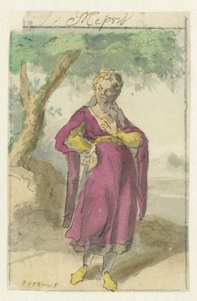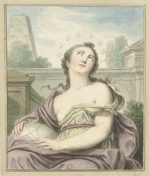 Curator: This intriguing piece, titled "Zekerheid," which translates to "Certainty," dates roughly from 1675 to 1737. It's currently held here at the Rijksmuseum, and attributed to Pieter van den Berge. Crafted using watercolor, it offers a fascinating window into genre painting of the period. Editor: Certainty, huh? Ironic. She seems anything but certain, actually. There’s a fragile quality to the composition, a hesitance in her posture. Curator: Well, Pieter van den Berge existed within the context of artistic patronage in the Dutch Republic. It's important to consider the commissioning structure which could be more speculative than representational, especially with a seemingly generic genre scene such as this. I mean, we lack evidence that she depicts a specific individual. Editor: That's a very valid point. Patronage undeniably shaped artistic intentions, though regardless, let’s consider the symbolic language. Note the presence of that decorative stone urn on the balustrade. Often, vessels like this can represent containing a secret. Or the possibility of potential…fulfilled potential? And her gesture seems to call attention to her...belly. Curator: An interesting interpretation. It's difficult to definitively link it to pregnancy, as was common at the time. Given the artwork's creation across a lengthy period, potential political readings could have fluctuated heavily during van den Berge's activity. If we apply a politically feminist framework we might look at how women were represented and how political opinions changed throughout the years it was worked on. Editor: And given the historical reality, of course her hand placement could hint at a pregnancy which would create a new, political layer within the composition of that certainty or perhaps anxiety. It's a compelling juxtaposition between visual signals. There is also a real softness to this work with pastel blues, yellows, and light browns that contribute to a sense of wistful thoughtfulness. Curator: Absolutely. Its enduring power lies in its capacity to continually resonate across varied viewpoints. It highlights the layered and evolving readings we can unearth as tastes, sociopolitical views, and our own realities affect art’s reception over time. Editor: Yes, and by doing so, it continues a fascinating discourse about uncertainty of not only her, but our certainty, in turn. Thank you.