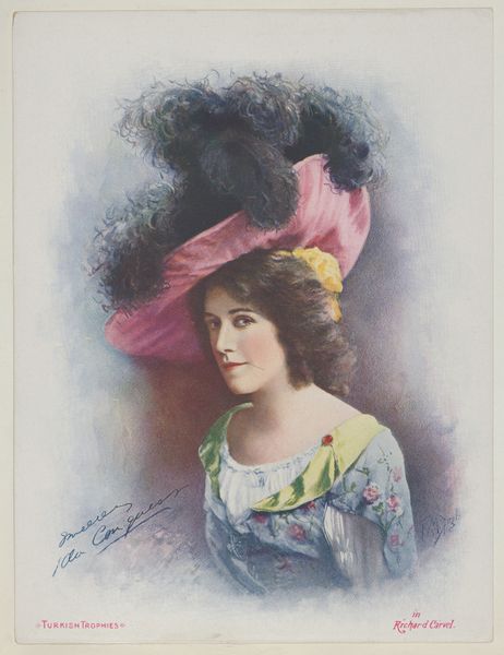 Editor: This is "Mary Mamering as Janice Meridith," a print made around 1900 by Frederick Moladore Spiegle as part of the Actresses series to advertise Turkish Trophies Cigarettes. I’m really struck by the idealized beauty and softness of this actress. How do you interpret this piece? Curator: The soft focus and delicate rendering invite us to consider what "beauty" symbolized at the turn of the century. Think of the Gibson Girl: that archetype, that aspiration. Mamering, in her role, embodies that era’s constructed ideal, carefully packaged and sold. Editor: So you are suggesting that there's more to it than just the image itself? Curator: Precisely. This print, distributed with cigarettes, functioned as a token of aspiration. Smoking, theatre-going, possessing beauty, all become intertwined symbols. It is a layered encoding of social desires and acceptable behavior. Can you see how her demure gaze still communicates something even today? Editor: Yes, the sideways glance. It makes her both approachable and slightly mysterious. And knowing it's connected to advertising gives it a completely different context! Almost like early celebrity endorsements? Curator: Exactly. This wasn’t just a picture; it was a carefully constructed cultural message. The soft pastel tones hide a sharper message. Cigarettes enabled a pathway to aspire towards these ideals, connecting back to performance and perception of self. Editor: I never would have looked beyond the surface-level prettiness! Thanks to the symbols you highlighted, it offers much to contemplate about ideals of beauty at the time, class aspirations, and the birth of celebrity culture. Curator: And how enduring those images become! Hopefully now the layers within such advertising materials become clear.