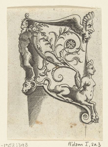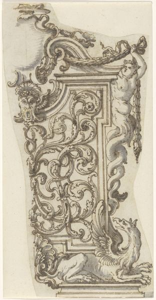 This is a design for a cane handle, made by Juste-Aurèle Meissonnier in the 18th century, using pen and black ink, with gray wash, on off-white paper. The technique suggested by this drawing is repoussé, where a sheet of metal is hammered from the reverse side to create a raised design. This was a popular technique for creating elaborate, three-dimensional forms in precious metals, like gold and silver. Repoussé requires careful planning and skillful execution, as the metal must be worked evenly to avoid tearing or distortion. The surface is highly ornamental, featuring figures in a garden setting. Note the intricate details in the rendering of the figures, the flowing drapery, and the delicate foliage. Meissonnier was a leading designer of the Rococo period, known for his elaborate and asymmetrical designs. This drawing showcases his mastery of the repoussé technique, and his ability to create dynamic and visually stunning forms. Consider the amount of labor that would have gone into creating such an object, and its function as a symbol of status and wealth. This design shows how the boundaries between art, craft, and design were fluid in the 18th century, and how skilled artisans played a vital role in shaping the material culture of the time.