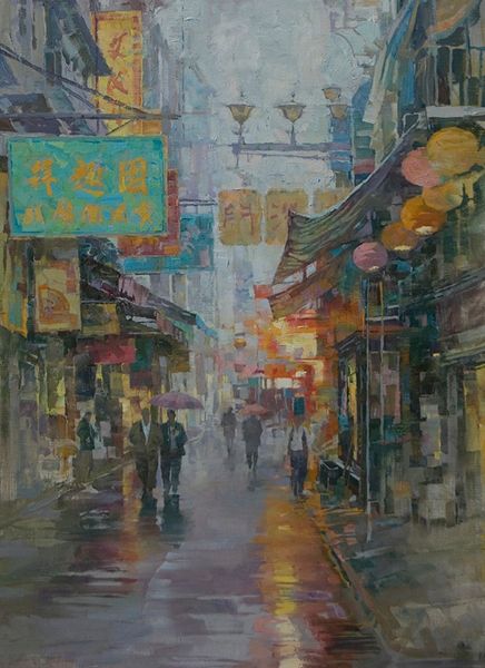 John Michael Carter painted "Hong Kong Street Market" using oil on canvas. It captures a moment from everyday life, yet it speaks volumes about the dynamic interplay of culture, commerce, and identity in Hong Kong. The piece invites us to consider the individuals who navigate and sustain these spaces. The woman walking through the market, laden with groceries, embodies the industrious spirit and resilience of the local community. The stalls overflow with produce, hinting at the rich culinary traditions and the economic vitality of the region. Consider how the artist’s perspective might reflect the gaze of an outsider, framing the scene in a way that both celebrates and exoticizes the culture. The painting prompts us to reflect on the complex layers of representation and lived experience within a globalized urban landscape.
