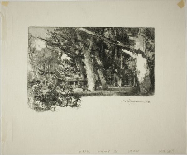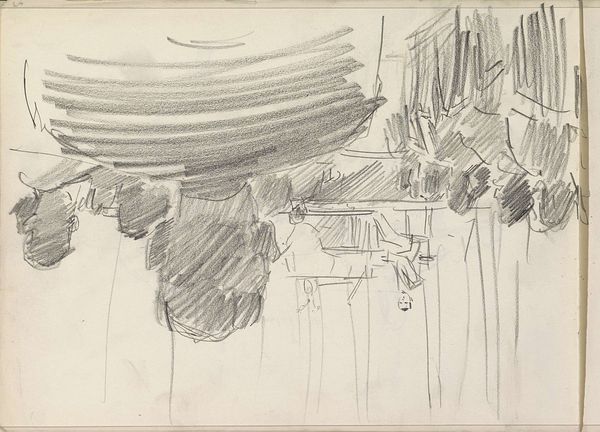 Curator: Here we have Cornelis Vreedenburgh's "Landschap met bomen en struiken," which translates to "Landscape with Trees and Shrubs," dating from between 1890 and 1946. It’s rendered in pencil, with some suggestion of watercolor, and is currently held in the Rijksmuseum. Editor: It possesses a very serene quality, wouldn't you agree? The overlapping strokes create a sense of depth and the dense foliage hints at a space both comforting and maybe just slightly melancholic. Curator: Considering the probable context, one can view it as less a finished artwork and more of a preliminary study. Pencil sketches, especially those with the ephemeral touch of watercolor, allow for efficient rendering of forms. Think of it as a means of rapid note-taking within the landscape – observing how forms coalesce or fall away with changing light and time of day. This way of creating informs how mass produced art was made using readily accessible materials like pencil. Editor: Interesting point about that immediacy of rendering... The very nature of a quick sketch lends itself to interpreting emotional impact, though. To me, those stark contrasts created with shading aren’t simply documenting light, but amplifying feelings of tranquility found in this particular landscape. Did he perhaps visit this locale seeking respite, turning to nature as a symbol for comfort or emotional clarity? Curator: I appreciate your personal interpretation, of course, and that reading into personal, emotional experience as valid for the work, but I find it much more intriguing to observe how Vreedenburgh uses layering and shading to depict texture of the foliage, as well as the efficiency with which he indicates relative distance and depth on what we may assume to be some type of mass produced paper pad using a mass produced graphite stick.. The social and material implications, in many ways, become a reflection of not only the art-making but the nature of our consumer society! Editor: But don’t you see how these humble materials serve to highlight this intimate, almost meditative state that invites us to linger within it—paper and pencil offering themselves as silent observers and a bridge from the visible landscape to the emotional one within ourselves? Perhaps he understood how art making also held potential cultural value with accessibility in both production and experience? Curator: I suppose that's something to consider for viewers encountering Vreedenburgh's process so long after its making: how its existence speaks to that broader network of artistic labor and material availability, beyond mere representation. Editor: Indeed... perhaps a glimpse into our own search for resonance with landscapes of inner feelings... or even as reminder of just how transient nature is.