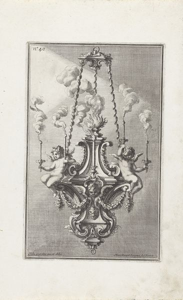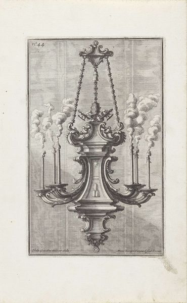 Curator: This is "Kroonluchter" or Chandelier, an engraving created around 1714 by Maximilian Joseph Limpach, currently held here at the Rijksmuseum. Editor: It has such a delicate feel for a chandelier, like a meticulously crafted dream. I'm drawn to the smoky tendrils rising from the candles; they give it a life of its own. Curator: Exactly! The medium lends itself well to exploring this period of decorative art, Baroque, characterized by elaborate and ornate forms. What I find compelling is the contrast between the object's inherent function, providing light, and the artistic labor involved in its meticulous depiction. Engravings were incredibly labor-intensive, reflecting the social hierarchies of patronage and production. Editor: That's a brilliant point. These objects were designed to impress, weren’t they? Think about the statement this chandelier makes, beyond illumination, about wealth and the ability to commission art. Consider also how that ostentatious wealth was acquired—tied to exploitation and inequality, defining power relationships within court circles. Curator: Precisely. And beyond wealth, we are seeing here form and the material of this decorative object interpreted through line, a translation into the print medium, showing a play between surface and volume. How the artist transforms something substantial into essentially line work. Editor: And that transformation, to me, reflects a society obsessed with appearance. It represents an elite class desperate to not only appear refined but also powerful—masking often brutal realities behind elaborate facades. The material production supports not just visual splendor but political theatre. Curator: The details invite a close look into its production, showcasing how printed images circulated design ideas during this period. We see a confluence of social ritual, craftsmanship, and the power of visual representation converging in something that transcends the domestic. Editor: Looking at this beautiful print, I can’t help but think about the ways that we use and produce these kinds of elaborate symbolic projections of status still today—we still adorn, we still project. Curator: Right. Thank you. By taking this look we understand that objects, materials and our labor is as powerful as the statements we project in visual art.