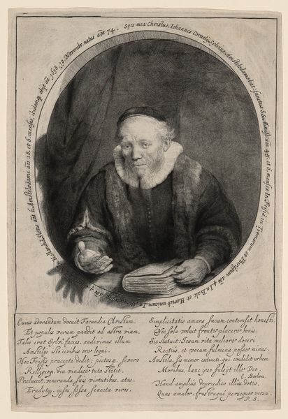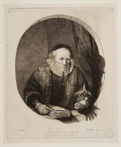 Curator: This is an etching by Rembrandt van Rijn, titled "Jan Lutma the Elder." It was completed in 1656. Lutma was a goldsmith of some renown in Amsterdam at the time. Editor: My first impression is how deeply textured the entire piece is, even though it’s a print. It's also a compelling portrayal of age and wisdom. His expression carries a history of experience, doesn’t it? Curator: Absolutely. Rembrandt really captured the spirit of the man. We know that Rembrandt and Lutma were friends and collaborators. This piece can be seen, in part, as honoring Lutma's contribution to the artistic community of the time. And it reveals Rembrandt's relationship with his fellow artists. Editor: The fur robe, the tools of his trade, like the compass… there's a lot here speaking to the symbolism of craft and its impact on the man himself. And I can't ignore that the robe gives him an almost magisterial presence. The compass could indicate the connection between earthly measurement and cosmic order. Curator: Precisely, those objects also connect Lutma with the guild system of the era and with Amsterdam's self-image as a hub for innovation and craftsmanship. This also elevates him within Dutch society. The fact that the piece is a print, and therefore repeatable, is not a mark against Lutma; on the contrary, prints disseminated images and therefore power. Editor: The weight of time is heavily implied here; Rembrandt, again, shows the passage of experience so well. There’s such depth and vulnerability in his face. His face is both world-weary, and filled with dignity and determination. Curator: Indeed. These images of artisans contributed to the burghers' sense of pride and importance as civic leaders. Even today, they tell us a great deal about the social values and structures in 17th-century Amsterdam. Editor: Thinking about how symbols reverberate and evolve across generations… this work almost anticipates the Romantic ideal of the artist, solitary yet possessing unique insight. Curator: I agree, although in Rembrandt's time, the "artist as genius" narrative was still in development, though he undeniably contributed to the formation of that concept. Editor: I hadn't really thought about this piece from that angle. Curator: It all comes down to understanding the broader social and political landscape, doesn’t it? Editor: And appreciating how the symbolic echoes create deeper connections with us, even today. Thank you, it has been an illuminating encounter.