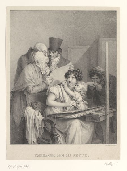 J.F. Clemens created this engraving, "Hans Egede plejer de syge grønlændere" using a monochrome palette. The composition directs our eyes through a sequence of interconnected figures in a structured interior space, illustrating a narrative of care and compassion. Clemens employs hatching to render textures and volumes, thus structuring the pictorial space through contrasts of light and shadow. The linear precision of the engraving technique allows for detailed representation, inviting close scrutiny of the figures' expressions. The symmetry of the composition, bisected by the figure of Hans Egede, balances the distribution of characters while subtly emphasizing his role. The scene functions as a symbolic tableau, employing signs and gestures to convey a sense of moral virtue. It's a constructed image designed to elicit a specific emotional and ethical response.