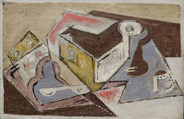 Curator: Here we have Juan Gris's "Bowl of Fruit", its date is unfortunately unknown. It's held here at the Tate. Editor: Immediately, I'm struck by the earthy tones. There's a subdued, almost melancholic atmosphere created by the limited palette. Curator: The fracturing of forms, typical of Gris’s Synthetic Cubism, evokes a sense of deconstruction. This reflects a modern unease, a questioning of stability after the war. Even the still life feels fragmented. Editor: Yet, within that fragmentation, there's a clear compositional logic. The geometric shapes interlock, creating a surprising harmony, a certain visual rhythm despite the dissonance. Curator: Fruit, historically a symbol of bounty and fertility, is here rendered almost sterile, its vibrancy muted. It suggests a loss of innocence, perhaps? Editor: Or perhaps a formal investigation into the essential nature of "fruitness," broken down into its component shapes and tones. Anyway, I find the use of line particularly deft. Curator: Yes, even in its muted presentation, "Bowl of Fruit" offers a fascinating look at how artists re-evaluated tradition. Editor: Indeed, and to that end, it really exemplifies the core tenants of cubism's formal language.