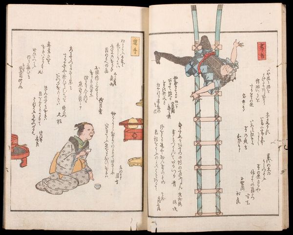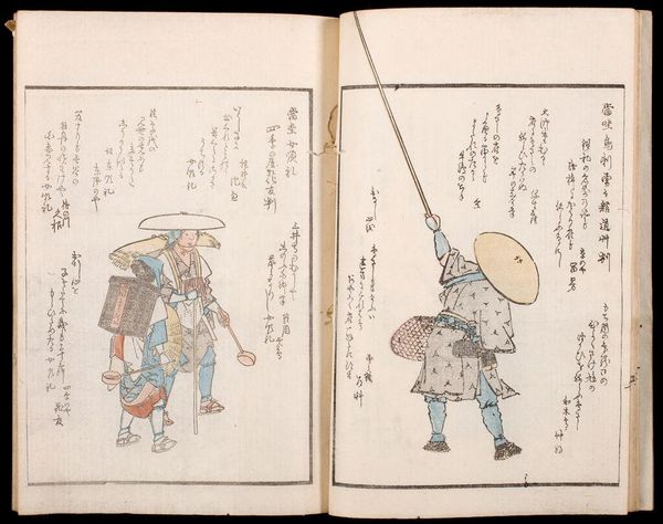 Curator: Let’s examine this page from Utagawa Hiroshige’s *Illustrated Book of Professions with Kyoka*, part of a seven-volume set held at the Harvard Art Museums. The imagery is striking, isn’t it? Editor: It is! The coarse paper, the strong lines of the figures, and the almost comic depiction of the sumo wrestler really grab my attention. It emphasizes the labor and physicality of these professions. Curator: Indeed, Hiroshige wasn't just documenting jobs. He was subtly commenting on social roles. The poems, or kyoka, alongside the images add layers of meaning, often with satirical or humorous undertones. Editor: Look how the woodblock printing allows for such dynamic expression with limited resources. The way the artist captures the weight of the wrestler and the delicate gestures of the geisha is impressive, given the limitations of the medium. Curator: Absolutely, and by juxtaposing seemingly disparate professions within a single book, Hiroshige encourages us to see the interconnectedness of society. Editor: I agree. The book reminds us that art can serve as a powerful form of documentation, even when working with mass-produced materials and images. I learned a lot today.