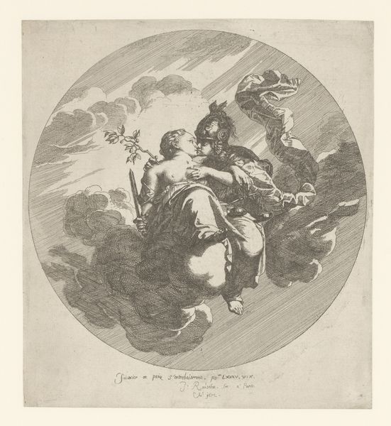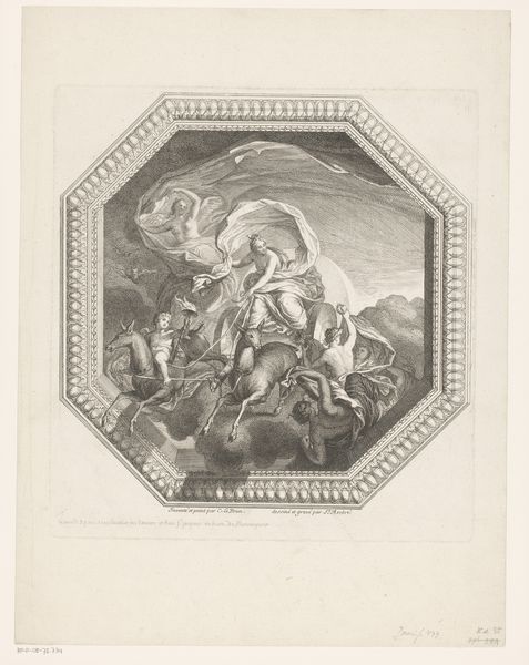 Francesco Bartolozzi created this oval Triumph of Faith print using grey ink. The allegorical scene uses soft lines and forms to express faith’s triumph, creating a sense of ascent. The work is structured around a central female figure, who holds aloft a chalice with a flame in one hand, and a cross in the other. Note how her body forms a diagonal line, from the bottom left to the upper right, drawing our eyes upward. The cherubs surrounding her add to the sense of movement, accentuating the diagonal composition. This deliberate arrangement of figures directs the viewer's gaze and emphasizes a visual hierarchy. Bartolozzi employs the formal elements of composition and light to symbolize the triumph of religious belief and its transcendence from earthly foundations towards the celestial realm, engaging with broader cultural narratives prevalent during his time. Ultimately, the print uses form to communicate themes of faith.